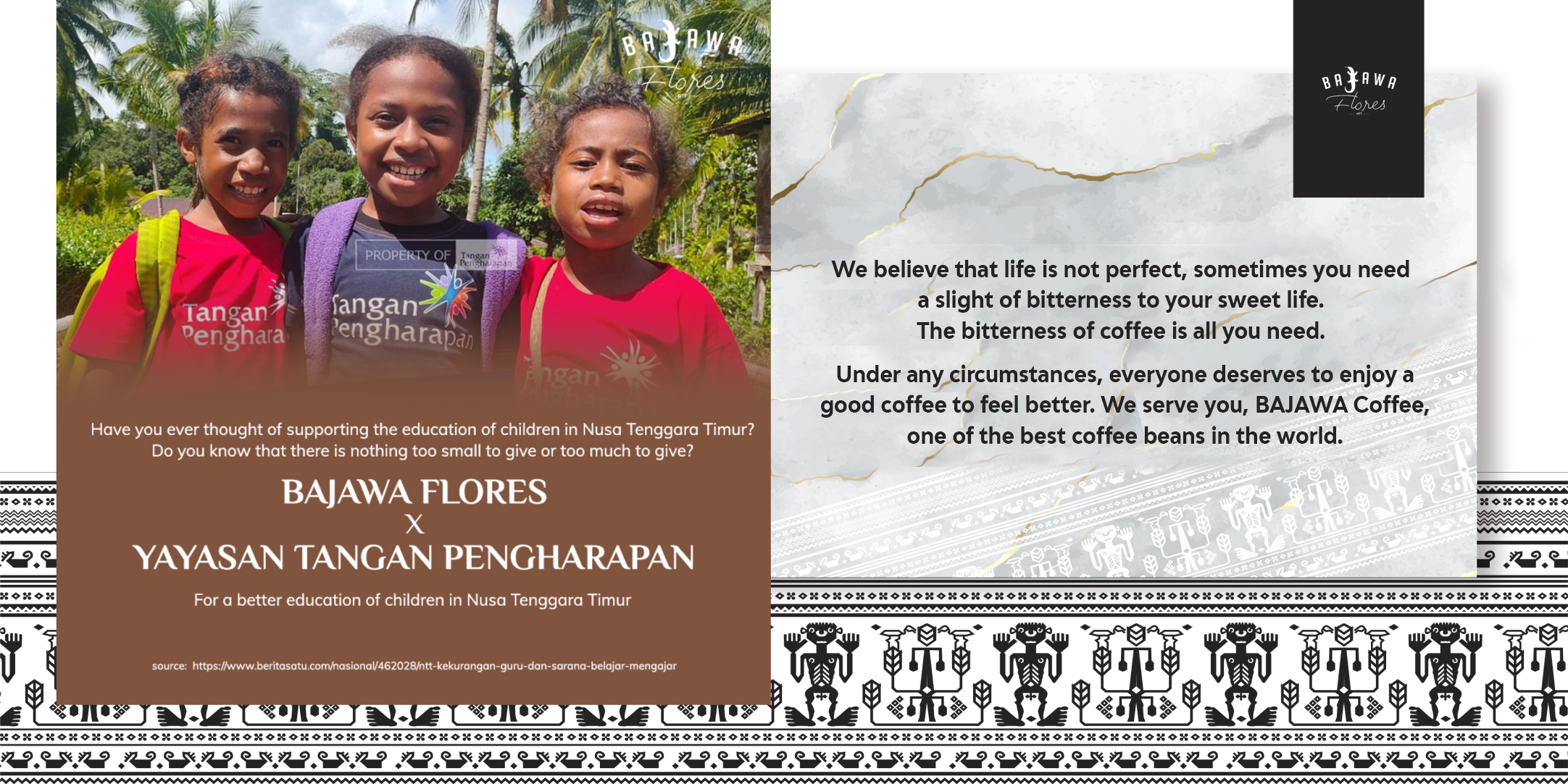 Dengan coffee shop Bajawa Flores milik putra putri asli NTT, kami berhadap dapat membantu anak-anak NTT melalui pendidikan. Dengan donasi pendidikan, anak-anak NTT dapat memiliki pendidikan dan masa depan yang lebih baik.
